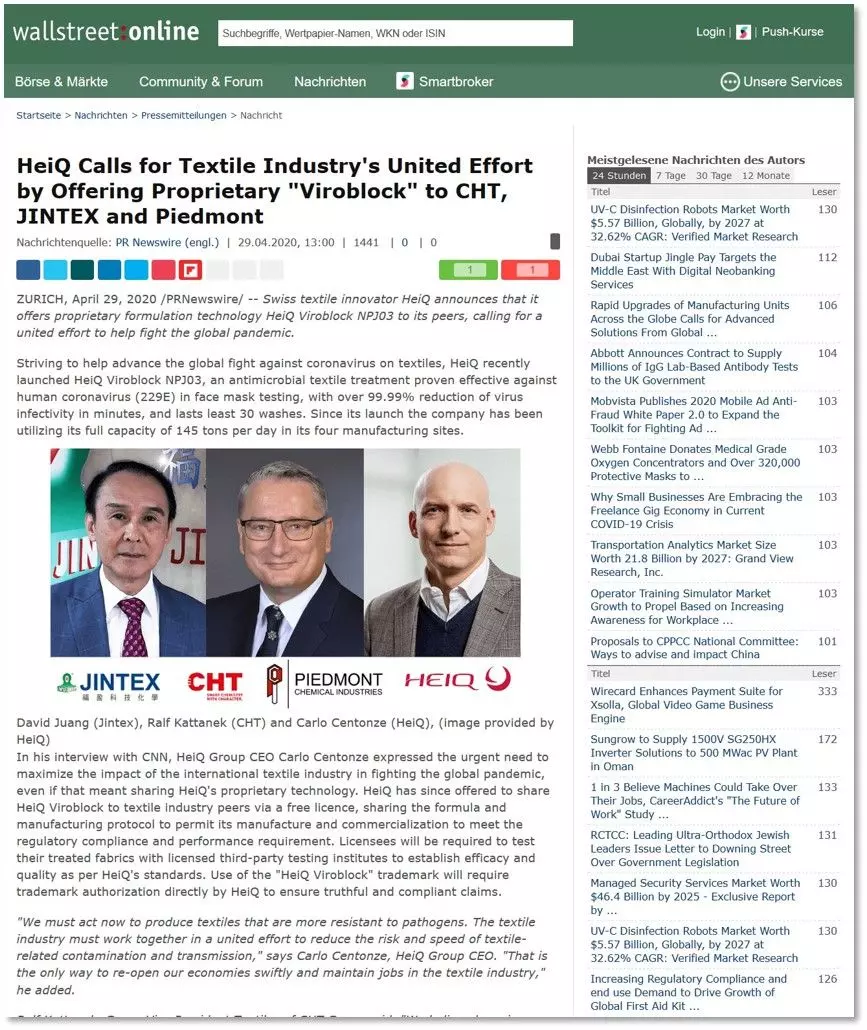 Cooperación estratégica global de Jintex y HeiQ - Únase en tiempos de crisis para contribuir a la lucha contra la epidemia.
